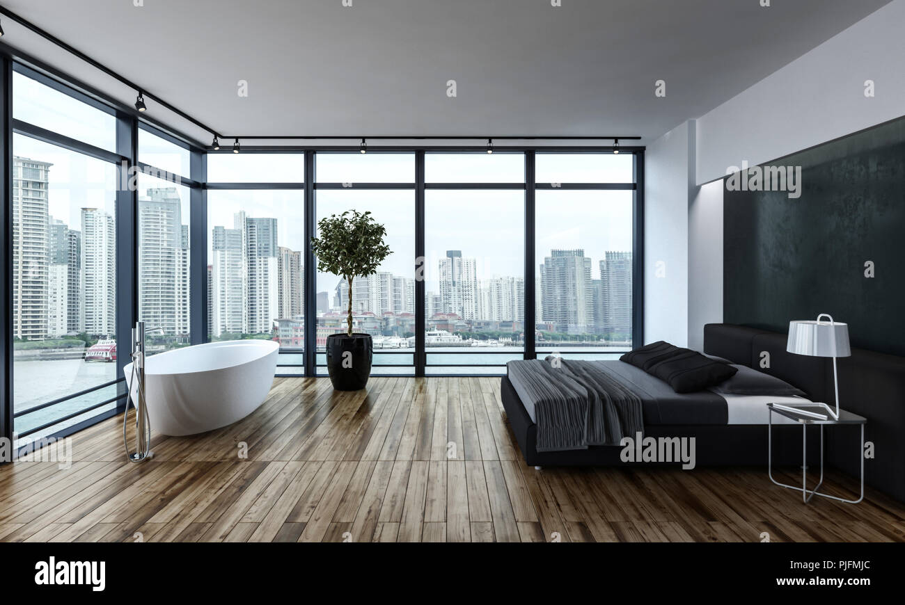 Modern Bedroom With White Bathtub And Large Grey Bed Next To Leafy