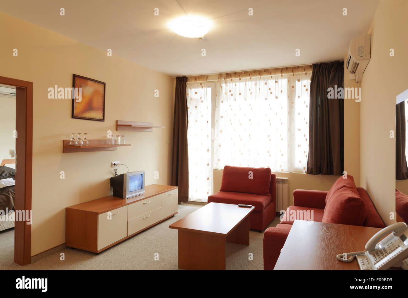 Interior Design Modern Small Hotel Room With Tv Stock Photo