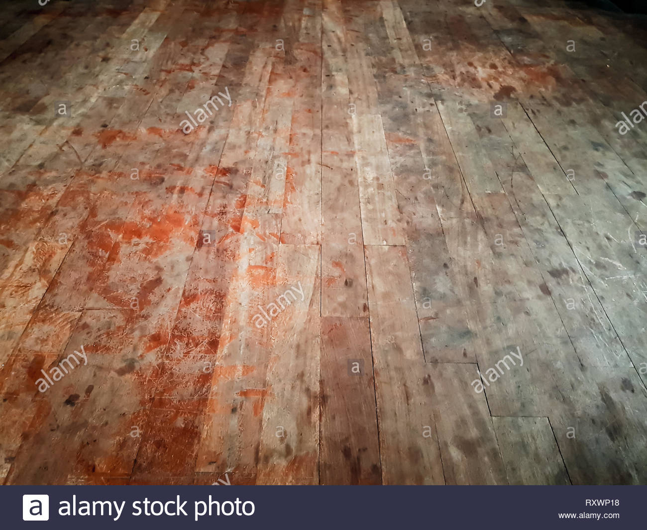 Scuffed Dirty Hardwood Floor Showing Red Stains Resembling Blood