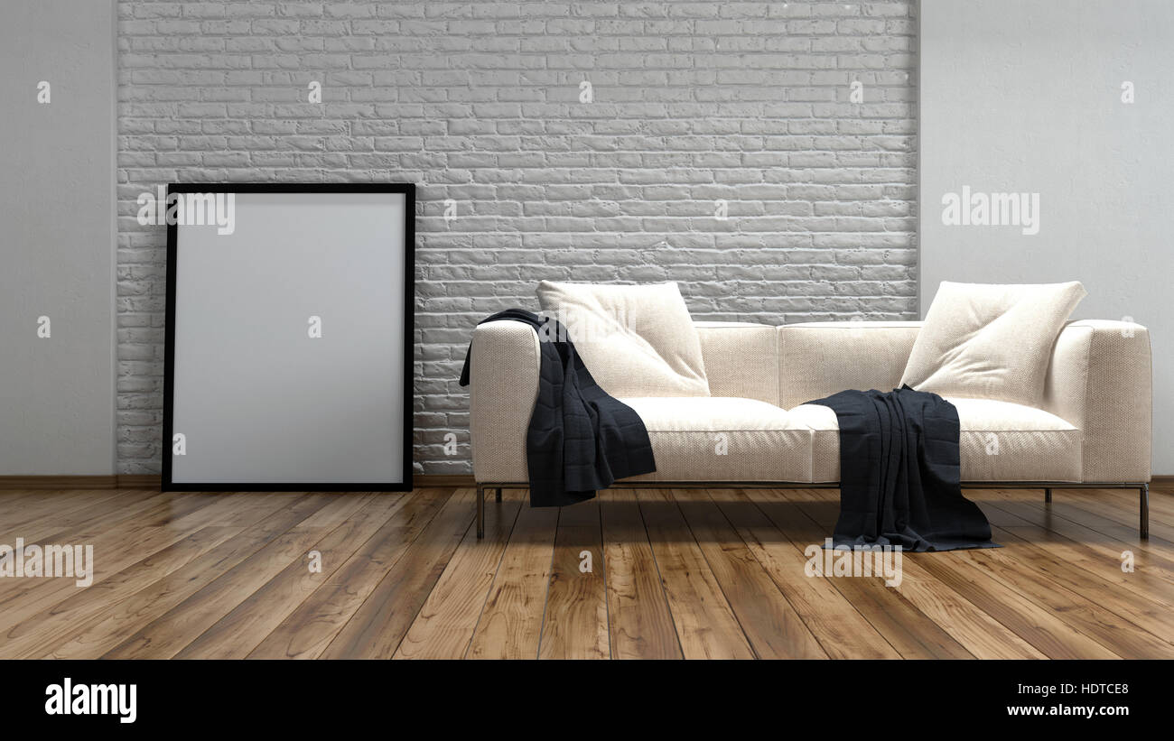 Comfortable Cream Couch And Large Rectangular Blank Picture Frame
